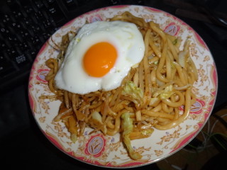 単なる焼きうどんでも、玉子を載せれば美味しそうに見えます。
