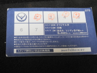 5月ぐらいにこのカードをもらったときはそこそこ期間が長いこともあり、スタンプ21個でもらえる丼や、14個でもらえる茶碗を集めようとも一瞬思いました。