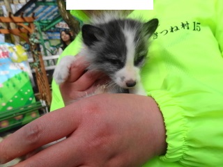 従業員さんからプラチナの子ギツネを渡されると、今年はしっかり両手で抱っこしました。
