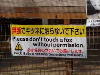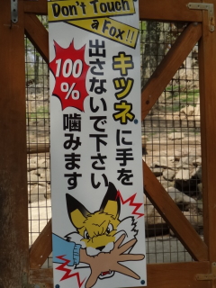 最後はキツネが放し飼いにされているコーナーへ向かったのですが、やたらと「キツネに触らないで下さい」的な看板が目に入ってきます。